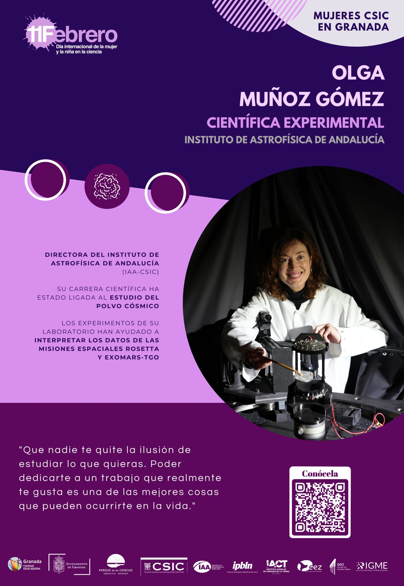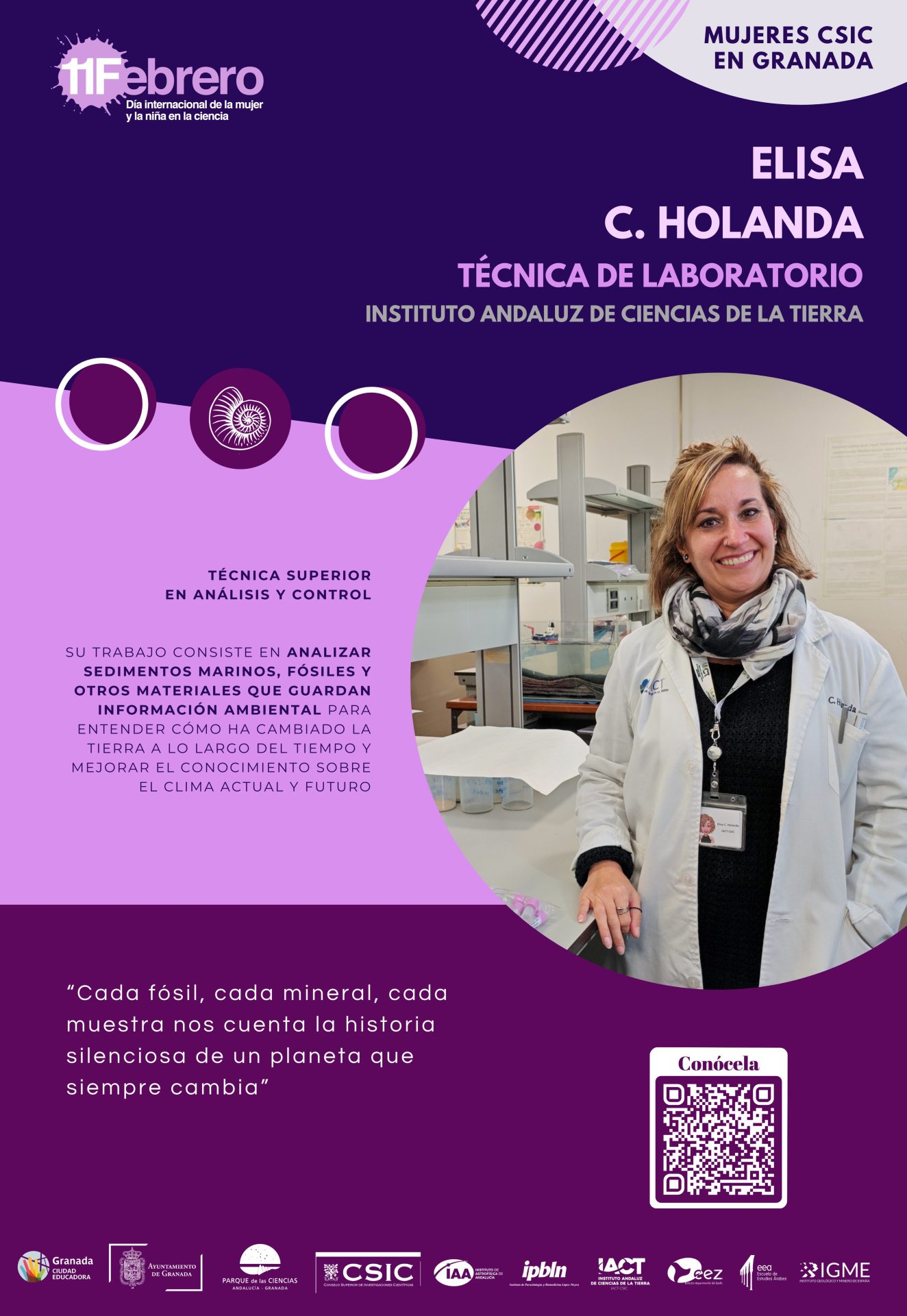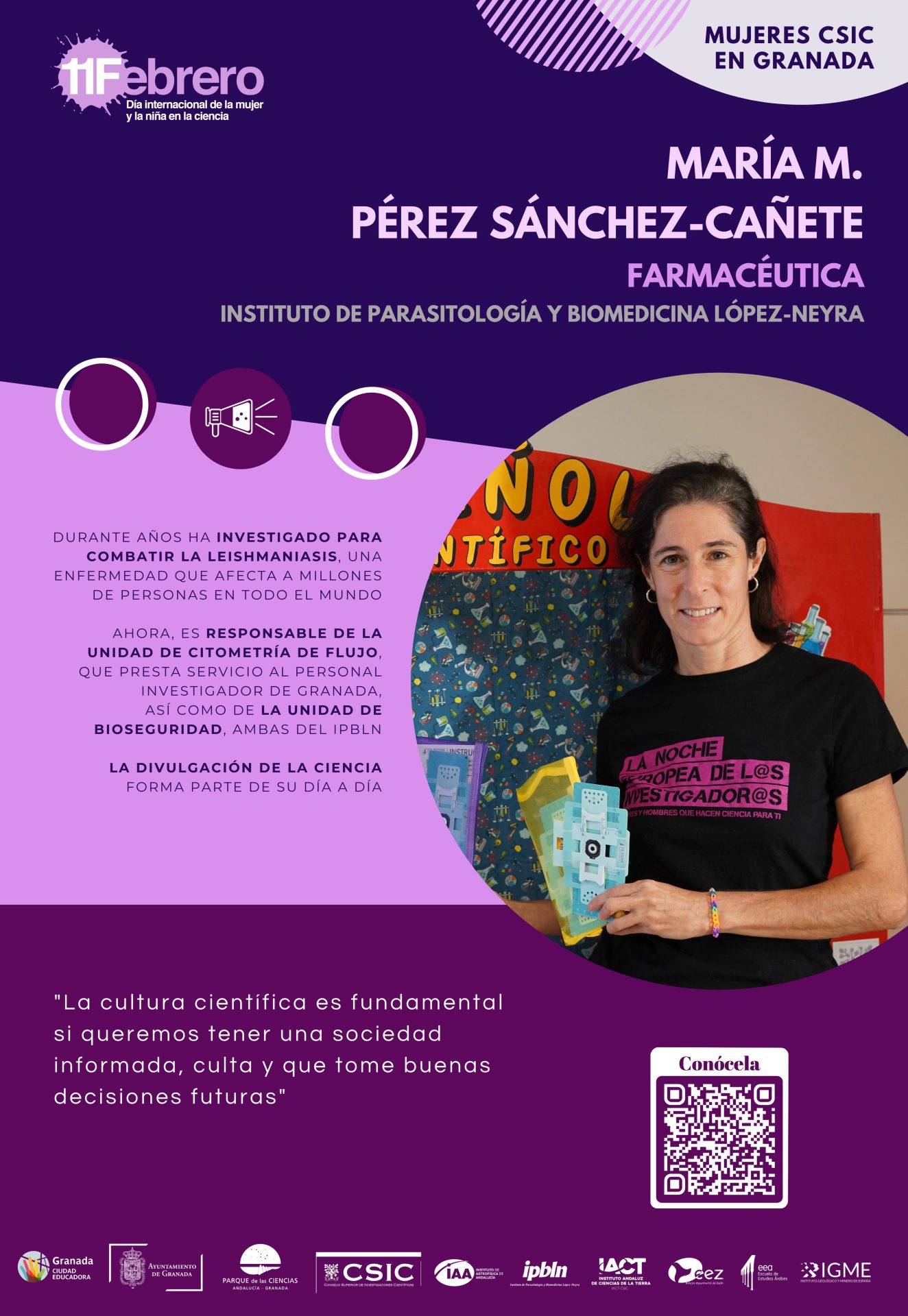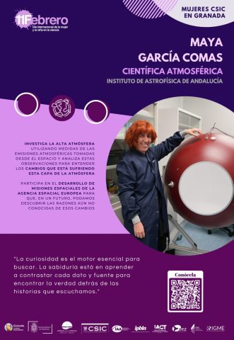 Por segundo año, con motivo del «Día Internacional de la Mujer y la Niña en la Ciencia» el Ayuntamiento de Granada (Servicio de Igualdad y Educación) junto con la Red de Igualdad y Diversidad de los centros CSIC de Granada (el Instituto de Astrofísica de Andalucía, la Estación Experimental del Zaidín, la Escuela de Estudios Árabes, el Instituto de Parasitología y Biomedicina López Neyra, el Instituto Andaluz de Ciencias de la Tierra y el Centro Nacional Instituto Geológico y Minero de España) hemos querido visibilizar y dar a conocer el trabajo de 18 científicas que trabajan actualmente en estos seis centros del CSIC en Granada.