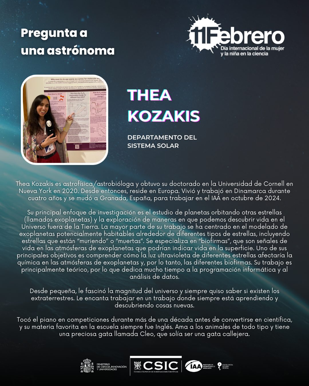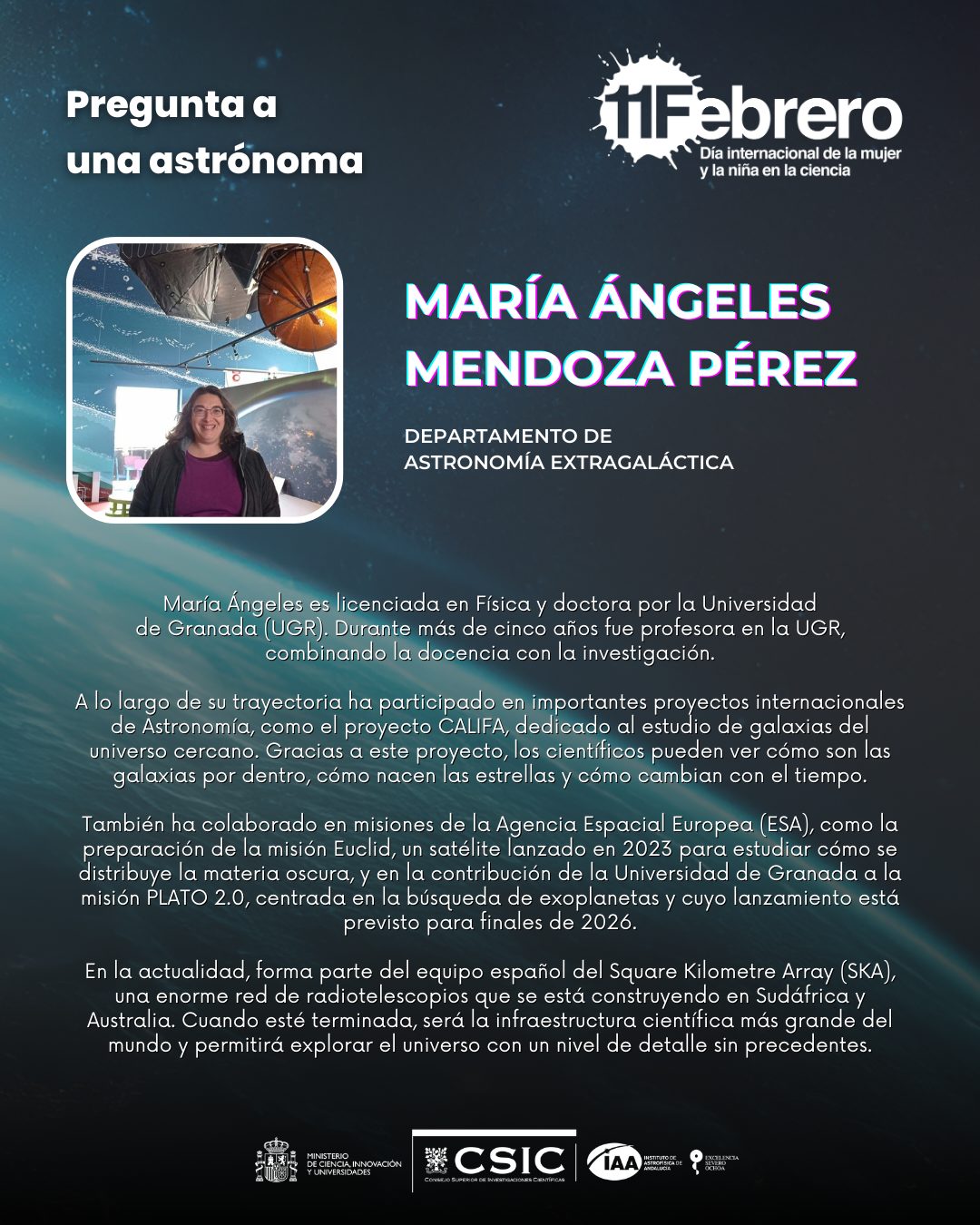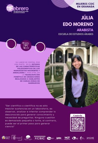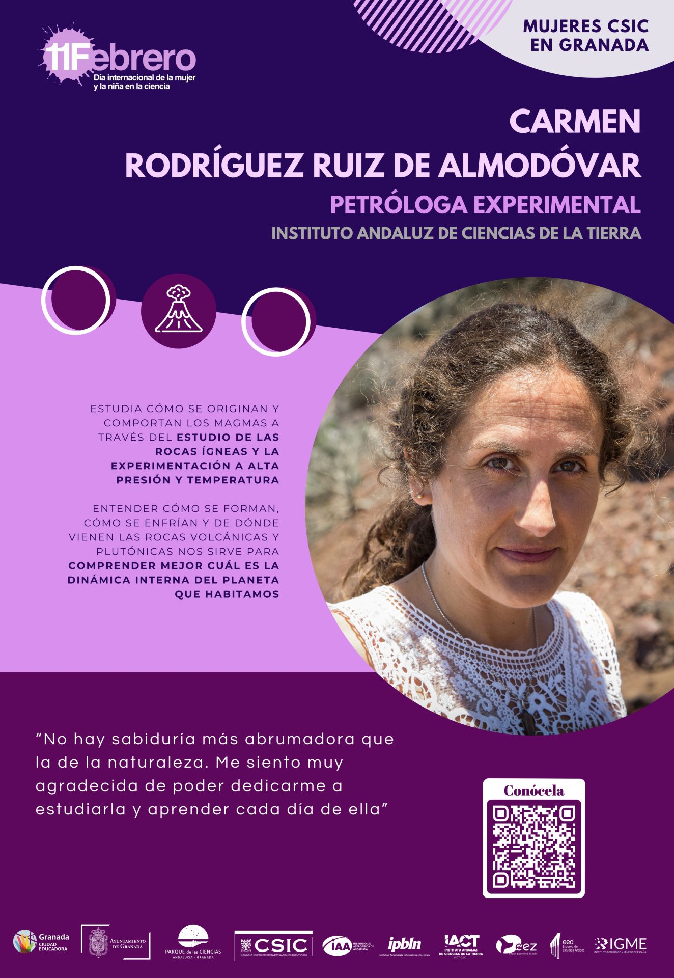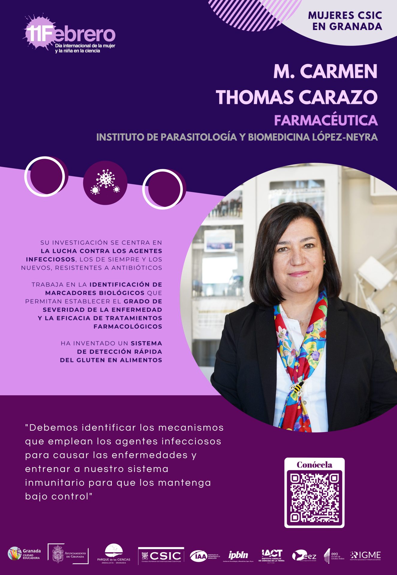 Por segundo año, con motivo del «Día Internacional de la Mujer y la Niña en la Ciencia» el Ayuntamiento de Granada (Servicio de Igualdad y Educación) junto con la Red de Igualdad y Diversidad de los centros CSIC de Granada (el Instituto de Astrofísica de Andalucía, la Estación Experimental del Zaidín, la Escuela de Estudios Árabes, el Instituto de Parasitología y Biomedicina López Neyra, el Instituto Andaluz de Ciencias de la Tierra y el Centro Nacional Instituto Geológico y Minero de España) hemos querido visibilizar y dar a conocer el trabajo de 18 científicas que trabajan actualmente en estos seis centros del CSIC en Granada.