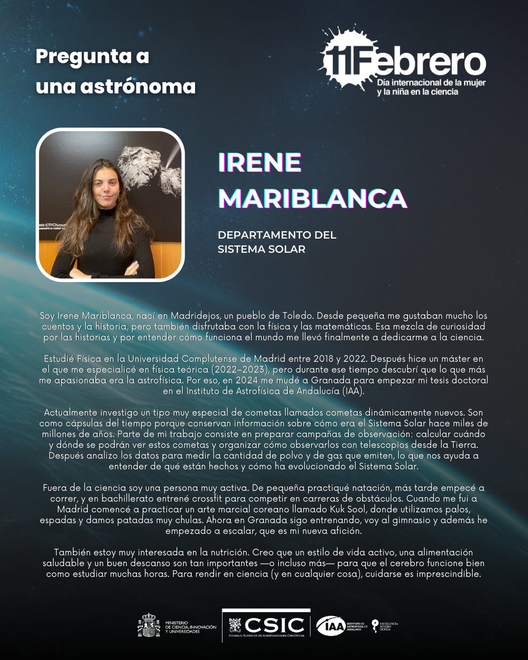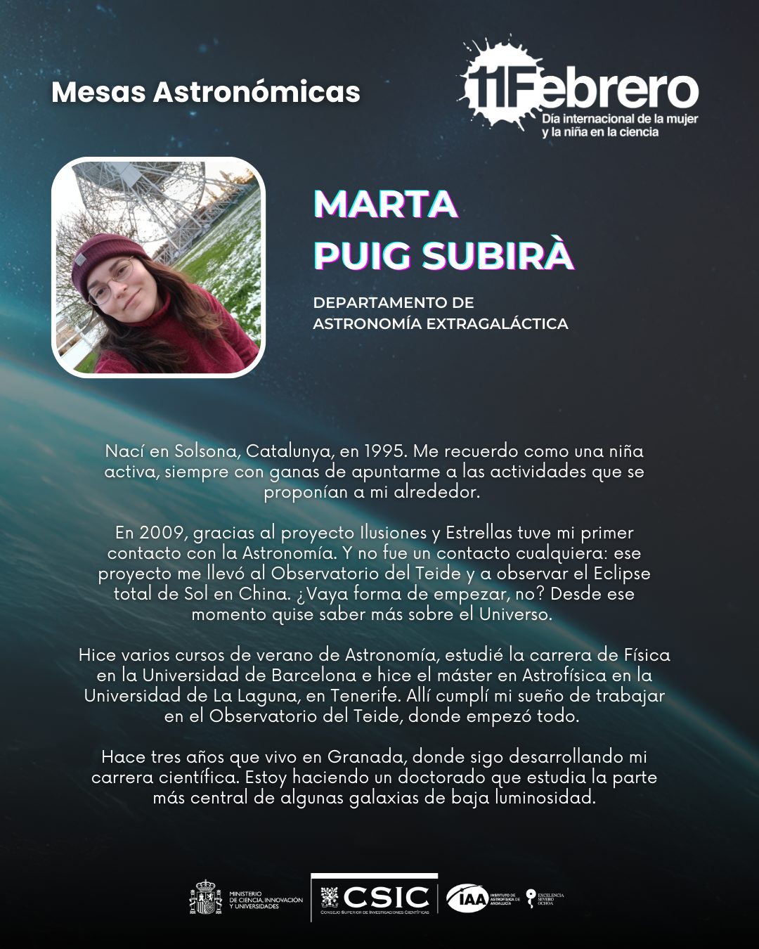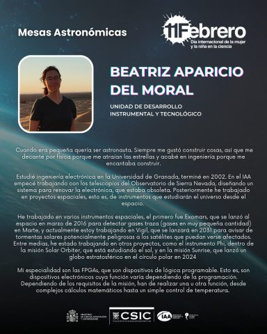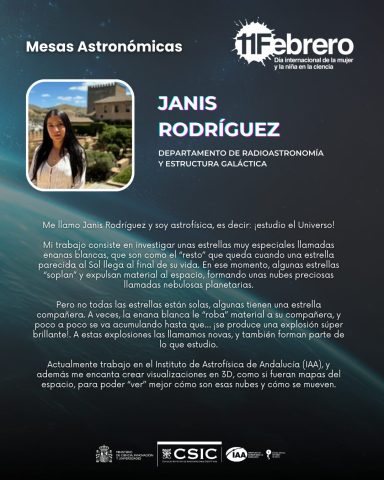 El Instituto de Astrofísica de Andalucía se suma un año a esta iniciativa con una serie de actividades en nuestro centro destinadas a visibilizar el trabajo de las científicas, y a crear roles femeninos en los ámbitos de la ciencia y la ingeniería que promuevan prácticas que favorezcan la igualdad de género en el ámbito científico.