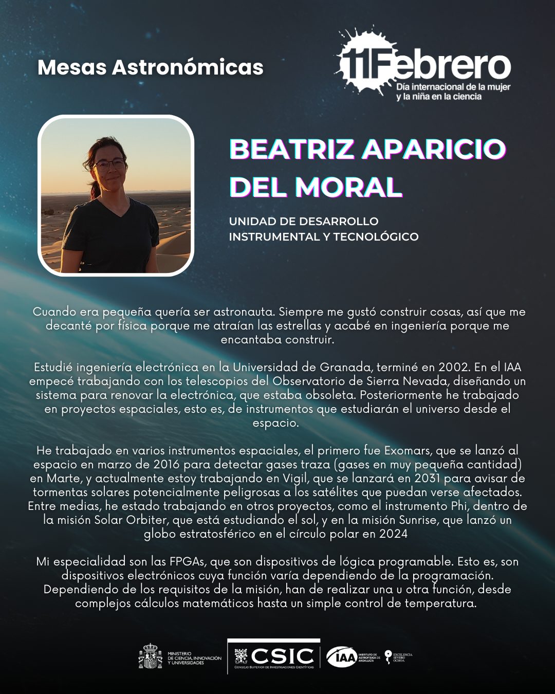 El objetivo de esta actividad es ayudar a despertar las vocaciones científicas y tecnológicas de alumnos y alumnas de secundaria, mostrar modelos a seguir y romper los estereotipos de los roles de género en las ciencias y las tecnologías con el fin último de contribuir a reducir la brecha de género en estos campos. Se trata de que cada uno de los grupos de estudiantes que participan conversen durante unos 10 minutos con cada una de estas mujeres que trabajan en distintas áread del Instituto de Astrofísica de Andalucía-CSIC, de forma rotativa, para resaltar el papel de la mujer en la ciencia y la tecnología en el área de Astrofísica y Ciencias del Espacio. Abarca la divulgación de los temas de investigación que se llevan a cabo en el IAA-CSIC y la discusión abierta sobre los roles de género y estereotipos existentes en torno a la ciencia, la tecnología, la ingeniería y las matemáticas.