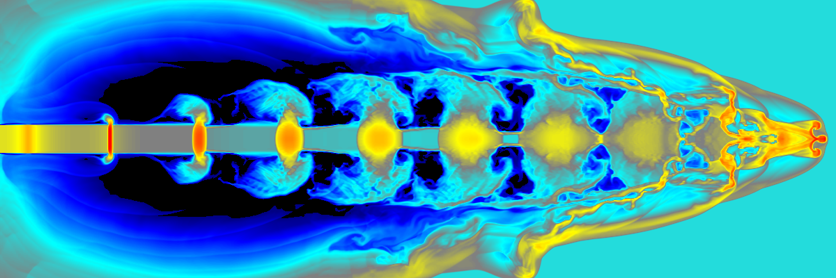 Simulación numérica de un jet con velocidad de eyección variable con el tiempo. Créditos: James M. Stone