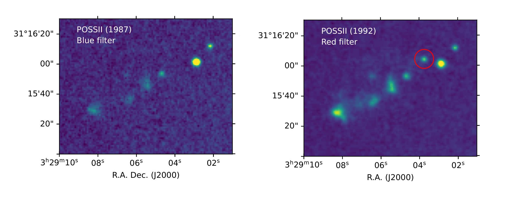 Imágenes en óptico de los objetos Herbig Haro HH7-11, tomada por el Palomar Observatory Sky Survey. SVS 13, la protostrella que conduce los HH7-11, se hizo visible en 1990. Crédito: STScI Digitized Sky Survey